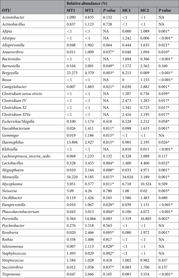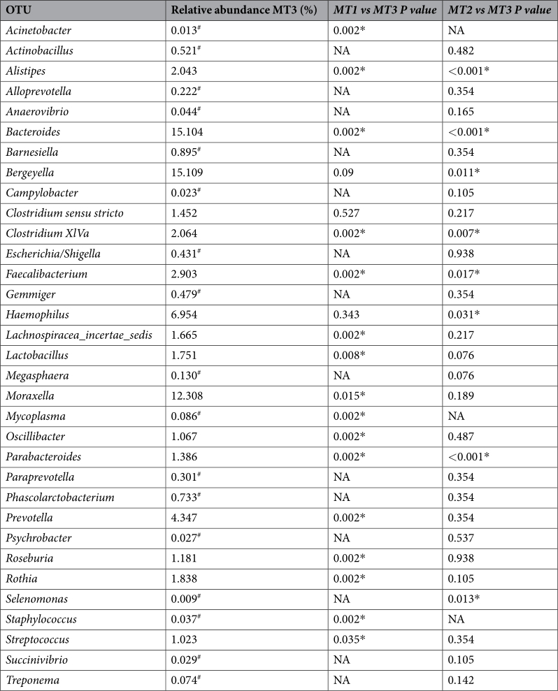 Table 2. Relative abundance of OTUs at third sampling time in MT farm compared with the previous samplings. *Significantly different. # The OTU is included in the list although having relative abundance less than 1% for comparison with previous samplings. NA, not available. When OTUs appeared at less than 1% of relative abundance in both sampling times, the P value was not estimated.