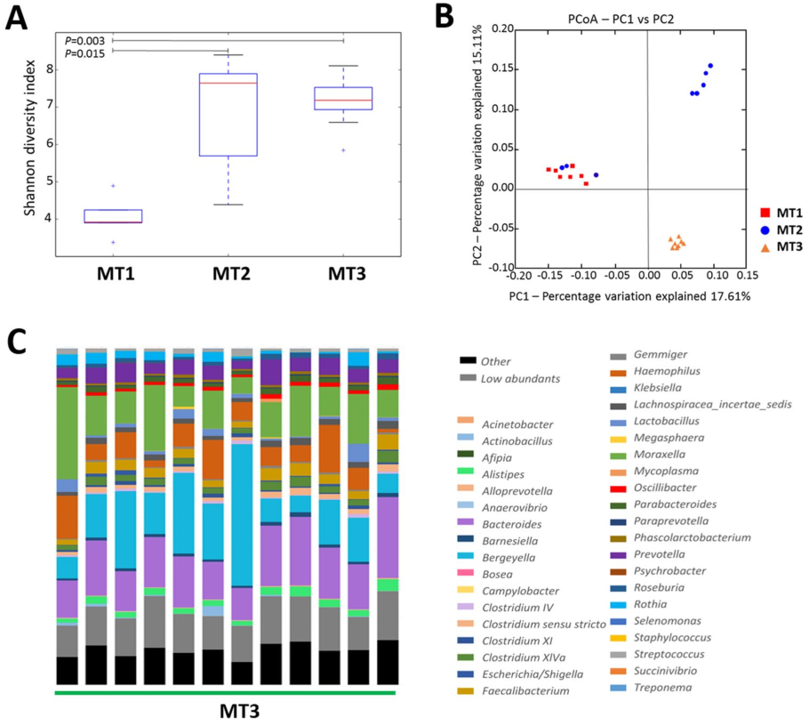 Stability of microbiota composition after antimicrobial elimination. In order to evaluate the stability of these changes in the nasal microbiota composition, a third sampling was performed in farm MT (MT3). In this run, we obtained a total of 4,003,077 joint reads after filtering (MT3, n = 12). Analysis of alpha diversity showed no further increase in diversity after additional time without perinatal antimicrobials in the farm (Fig. 3A, for a full list of OTUs assigned at genera level, please see Additional File 3). However, the samples after 5 cycles without antimicrobials showed a more similar composition demonstrated with the lower P value obtained through the comparison (Fig. 3A; Shannon index, P = 0.003). Besides, the beta diversity analysis, showed a distinct clustering at the three sampling times tested (Fig. 3B, adonis R 2 = 0.15643, P < 0.001). Sixteen genera were involved in the long-term changes observed after elimination of the antimicrobials (Table 2 and Fig. 3C). Nine of these genera were increased at the third sampling point after 5 productive cycles without antimicrobials, such as Faecaliabacterium and Bacteroides.