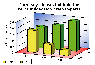 Best of all, this 21.7 percent drop in soy import prices coincides with Indonesia achieving self-sufficiency in corn. Corn imports, which totaled 1.6 million tonnes as recently as 2006, fell to 700,000 tonnes in 2007 and will amount to no more than 400,000 tonnes this year.Agriculture minister Anton Apriyantono stated that after expanding the corn harvest by 14 percent in 2007 and 12 percent this year, Indonesia aspires to achieve self-sufficiency in corn by the beginning of 2009.