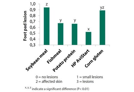 The trial results show a clear difference in the incidence of foot pad lesions between starter diets. While potato protein and fish meal perform well, the lowest incidence of lesions is evident in broilers fed the diet with HP AviStart.
