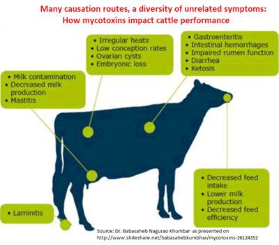 Whether it is by blocking ribosome protein, damaging intestinal cell wall integrity or switching DNA gene sequences 'on' or 'off', mycotoxins use numerous, subtle biochemical causation routes to create an entire array of symptoms, ranging from poor livestock growth to compromised animal immunity, infertility to cancer. Indeed, before mycotoxin biochemistry was understood, problems such as outbreaks of various diseases or miscarriages were treated as problems to be overcome, when they were merely symptoms of mycotoxin animal poisoning.