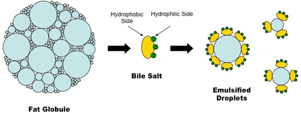 That's where bile comes into action. Bile salts break down large fat particles into a large number of very small particles. This process is called emulsifying. This significantly increases the total surface area of fat particles, enabling the lipase to achieve fat breakdown better and faster.