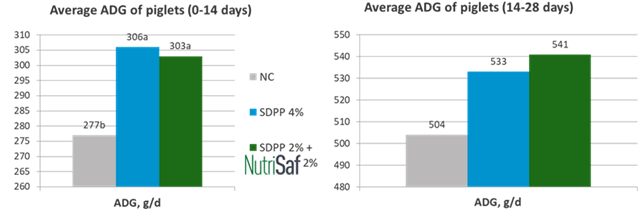 Figure 6 : Effect of Nutrisaf® 2% on ADG of weaned piglets, 14 days, and 14-28 days period post weaning ; compared to unsupplemented or SDPP- supplemented (4%) piglets (Qiyu Tian et al., 2016 ; unpublished data).
