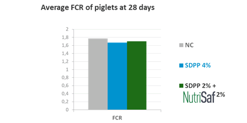 Figure 7 : Effect of Nutrisaf® 2% on FCR of weaned piglets, 28 days post weaning compared to non-supplemented or SDPP-supplemented (4%) piglets (Qiyu Tian et al., 2016 ; unpublished data).