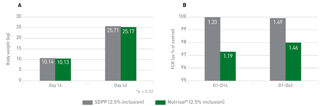 Figure 8: Replacement of SDPP with Nutrisaf® improves body weight (A) and FCR (B), when piglets are supplemented for 14 days after weaning (21 days old).