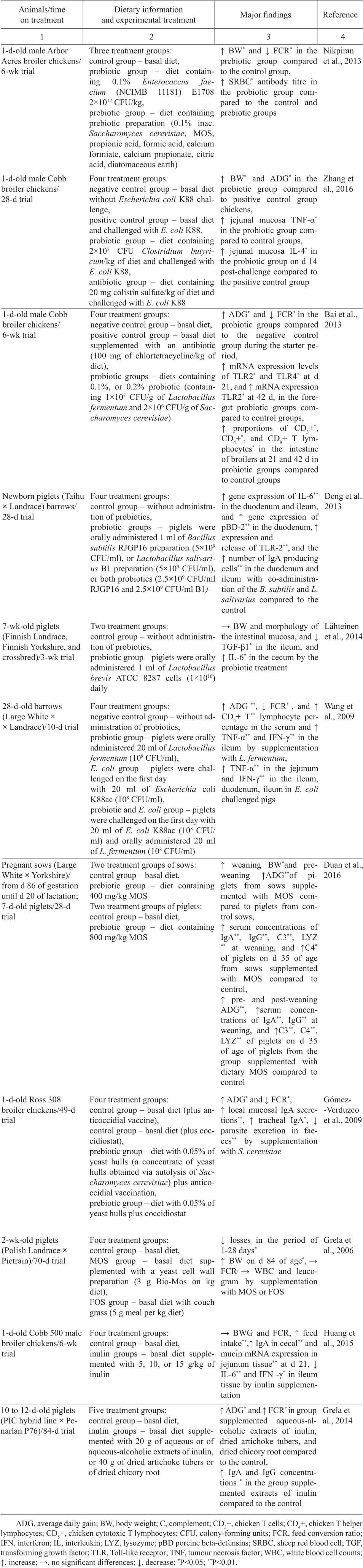 Table 1. Studies using probiotics and prebiotics as immunostimulants in monogastric animals