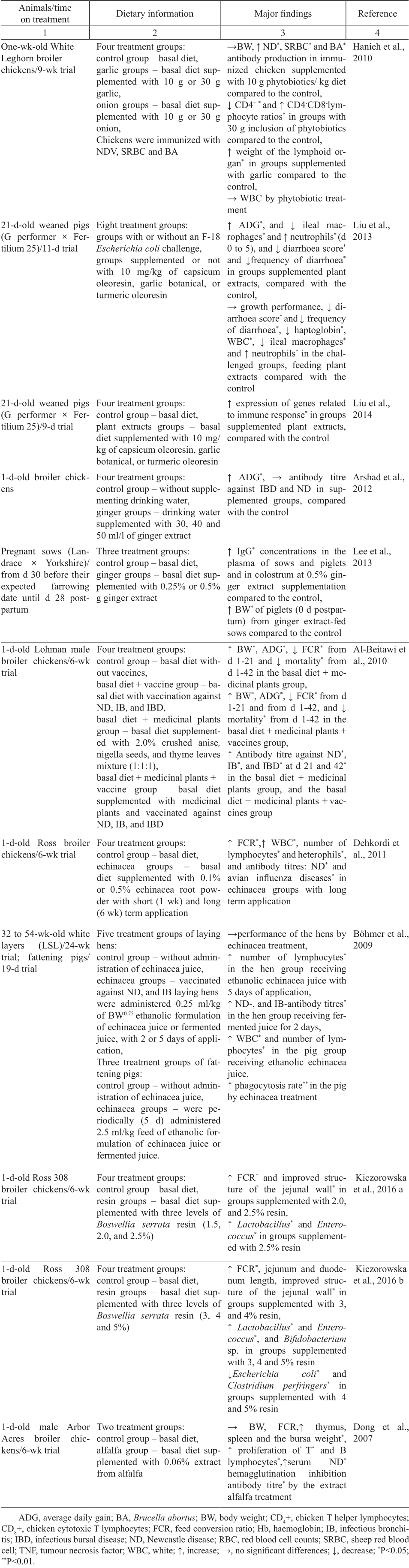 Phytogenic effects have been proven in poultry and pigs for feed palatability and quality, growth promotion (improved weight gain and feed conversion ratio), gut function, endogenous enzyme secretion and nutrient digestibility (improved growth), gut microbiota (improved growth, reduced mortality), and immune function (improved health) (Yang et al., 2009; Grela et al., 2013; Liu et al., 2013, 2014; Yazdi et al., 2014; Kiczorowska et al., 2016 a, b).
