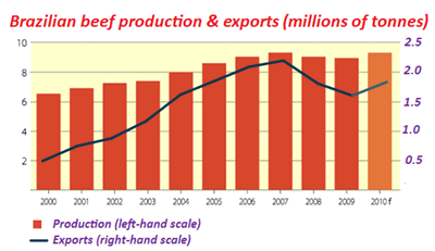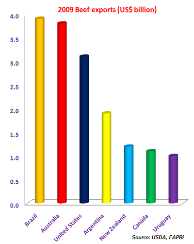 With Brazil at the forefront and Argentina and Uruguay adding further momentum, Latin America has assumed pride of place in world beef exports. At US$6.8 billion, Brazil, Argentina and Uruguay's 2009 combined beef exports roughly equal those of the United States and Australia. Yet, Brazil is increasingly stealing the show and South America's junior beef exporters will have to learn the art of niche marketing.Abundant feed, low costs, power Brazilian exports
