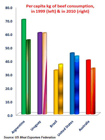 On the other hand, Argentina, which has a reputation for very high quality beef, finds itself beset by several simultaneous conundrums. It wants to maintain domestic supermarket shelves well-stocked and prices low to the point of restricting beef exports. This however, is destroying the incentive to maintain cattle herds, let alone expand them. Even as its exports fall and Argentine cattle numbers dwindle, its historically high domestic per capita consumption has fallen more sharply than that of any other major beef producer over the last ten years.
