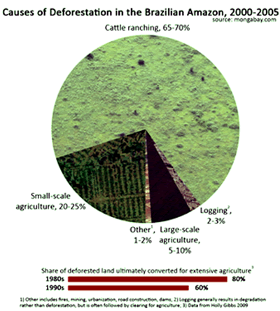 In Brazil for example, the government reports that the number of cattle raised in feedlots grew from 950,000 in 1990 to over two million in 2010. As farmland formerly used for cattle are converted to feed grain and oil seed production, the new feedlots often are located in northern Brazil, sometimes in the controversial Amazon river region. As the accompanying graphic clearly shows, this does much to expose Brazilian beef exports to criticism about environmental destruction and sustainability.