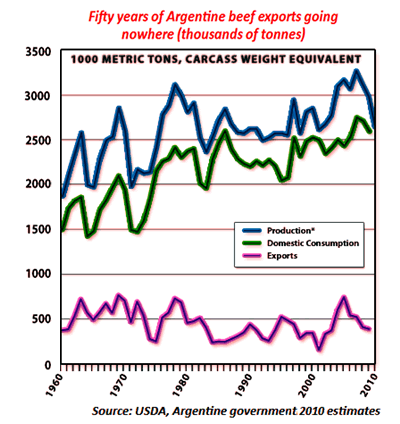 Domestic political considerations are also holding back Argentine beef exports. Drought-induced slaughtering caused cattle prices to spike. To ensure lower domestic prices and sufficient domestic supplies, the government limited 2010 beef exports to 350,000 tonnes, which is 16.5% lower than 2009's 419,300 tonnes. To further increase domestic beef supplies, in May 2010, the government raised the minimum cattle slaughter weight to 153kg.