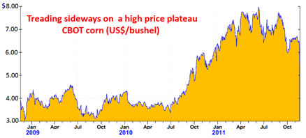 Many believe that once December's post-harvest season surplus is cleared, corn should resume its rally. For example, Standard Chartered Bank analyst Abah Ofon believes that while the rally will be less inflationary than early 2011's run up, CBOT corn could average US$7.75/bushel in the first quarter of 2012, implying a price north of US$8/bushel by the second quarter of next year.