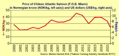 According to USDA statistics, the average unit price of exported Chilean salmon fell 22.9%, from US$7.78/kg in 2014 to US$6.00/kg in 2015. As a result, despite exporting 2.1% more salmon in 2015 than in the previous year, export earnings fell a whopping 21.3%, from US$3.372 billion in 2014 to US$2.655 billion in 2015.