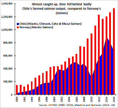 Over the longer term, an exporter that once appeared to overtake Norway as top producer finds its output boxed for nearly a decade. According to FAO statistics, in 1990 Chile farmed a mere 23,121 tonnes of Pacific and Atlantic Ocean salmon species, amounting to a mere 16% of the Atlantic Norway's 145,990 tonnes of Atlantic salmon grown by Norway