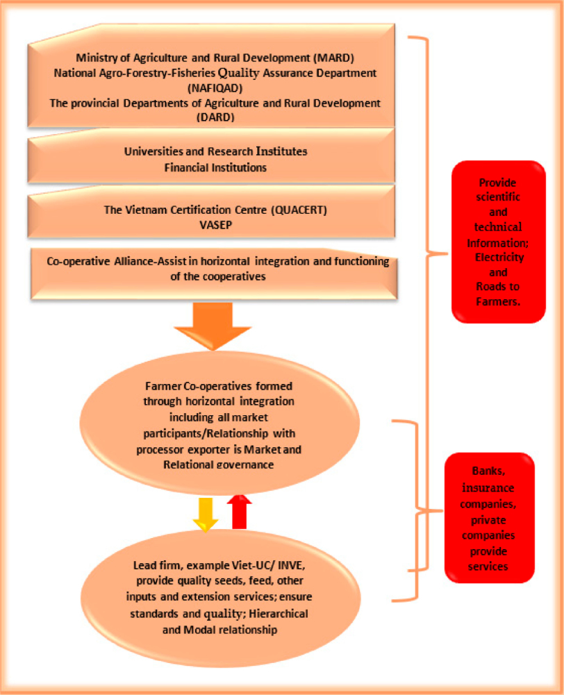 Vertical integration allows the small-scale limited resource farmers to be socially sustainable in that each firm remains as a business entity in making decisions and participate indirectly through their votes in the governance structure of the value chain. VIET-UC as the lead company promised to supply the inputs and ensure that the cooperatives are adhering to the VietGAP standards that globally include regulations by the other certifying bodies. VIET-UC will then develop a captive or hierarchal relationship with the small businesses. Indirectly, the larger company has an overall sight control over several production or distribution steps involved in product sales and marketing. The cooperatives can then relate their concerns about the effect of consumer standards on the production process forward to importers.
