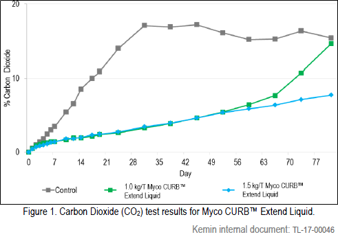 In a trial to evaluate the efficacy of Myco CURB™ Extend Liquid in preventing mold growth, a batch of corn was treated with the product. This test measures the carbon dioxide released in a closed system where samples are incubated. As mold produces carbon dioxide during its metabolism, the carbon dioxide released serves as an indicator of moldactivity in the samples.