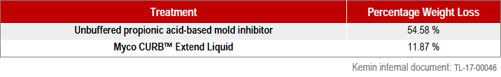 The formulation of Myco CURB™ Extend Liquid is optimized and buffered such that it has a near neutral pH level. This allows safe handling and prevents corrosion to silos and equipment. An experiment was done by partially submerging galvanized metal strips in unbuffered propionic acid-based mold inhibitor and Myco CURB™ Extend Liquid. Table 1 shows the percentage of weight loss due to accelerated corrosion at 65°C for 11 days.
