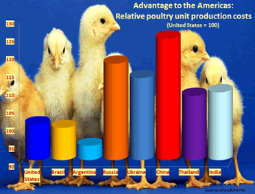 But wage levels do not matter much to Brazil, as it is a mass poultry producer, not a niche value-added supplier. A September 2011 Rabobank report ("Cross Roads for Growth: The International Poultry Sector Towards 2020") estimated that Brazil accounts for 80% of the world's whole bird exports and 85% of breast meat exports respectively.