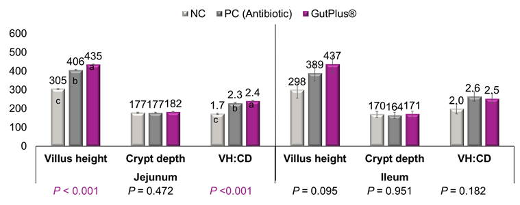 Optimal gut morphology is essential not only for biological functions such as digestion and absorption but also for protecting the pigs from harmful pathogens. The most commonly measured gut morphological parameters are villus height (VH), crypt depth (CD) and villus height to crypt depth ratio (VH:CD ratio). Increased VH may result in a greater absorptive capability for available nutrients, whereas reduced CD indicates a decrease in metabolic cost of epithelium turnover. In this study, pigs fed diets supplemented with GutPlus® had the greatest (P<0.001) VH and (VH:CD) among treatments on day 18 (Figure 2). No difference was observed on CD among treatments. In ileum, no effects of treatments were observed in CD or VH:CD, but GutPlus® tended ( P= 0.095) to increase VH at greater extent than AGP compared to NC pigs.