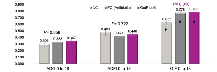 Growth performance of weaned pigs during E. coli K88 challenge (18 days) are presented in Figure 1. There was an increase in gain:feed with AGP and GutPlus® treatment compared to the NC group, while no difference between AGP and GutPlus® was observed. Two out of 7 pigs receiving the NC diets died on day 1 and 2 after the challenge as a consequence of the E. coli infection while pigs fed AGP and GutPlus® had no mortality. These improved feed efficiency and survival rate of pigs fed GutPlus® were due to enhanced gut morphology (barrier function) associated with lower diarrhea rate.